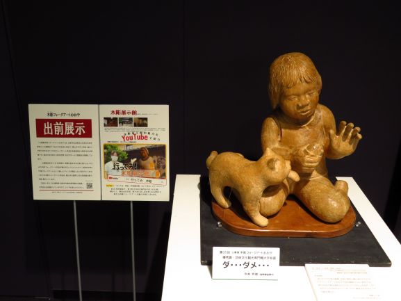 公募展木彫フォークアートおおや優秀賞・芸術文化観光専門職大学長賞受賞作品出前展示について 2021年、公募展木彫フォークアートおおやで優秀賞・芸術文化観光専門職大学長賞を新たに設けていただきました。 そういったご縁で今年も受賞作品を期間限定で当館にて展示しております。 展示作品は第31回優秀賞・芸術文化観光専門職大学長賞を受賞した『ダ・・・ダメ・・・』です。 学術情報館にお立ち寄りの際は是非ご覧ください。